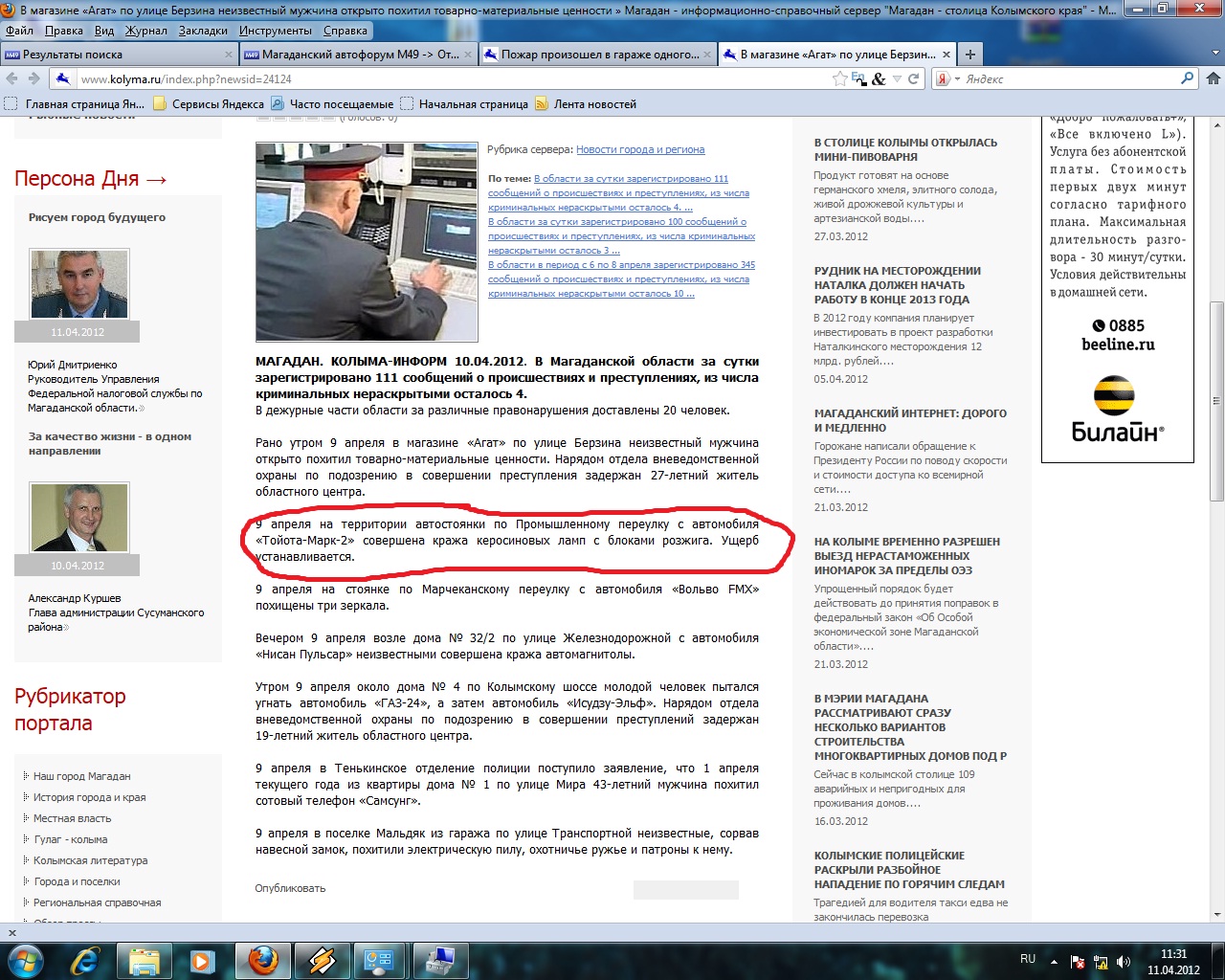 "9 апреля на территории автостоянки по Промышленному переулку с автомобиля «Тойота-Марк-2» совершена кража