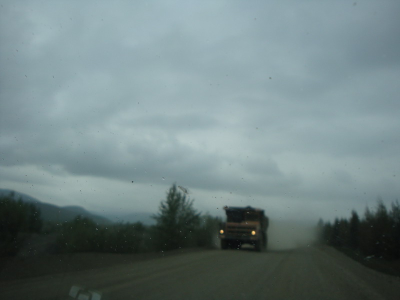 Едем дальше, дорога спускается в долину, полигоны заканчиваются, дождь тоже:) На встречу едет КрАЗ наливник, тормозим что бы распросить про дорогу, но кразист оказался хорошо поддатым и конструктивного диалога не получается