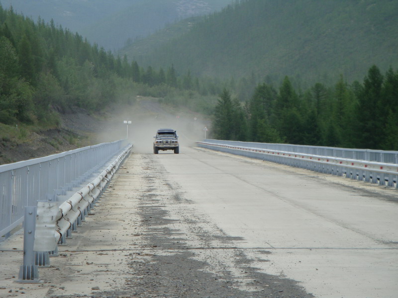 Доходим до очередной развилки, на право Мария Раскова, нам опять налево. Свернули…дальше цивилизация заканчивается, интенсивность движения по этому участку 3-4 машины в год, не больше, хотя дорога хорошая…местами. Иногда получалось разгоняться до 50 км/ч. Бетонные мосты стоят, но с обсыпанными заездами, деревянные разрушенны, так что проходить реки только в брод.