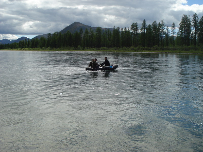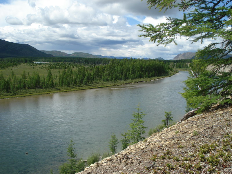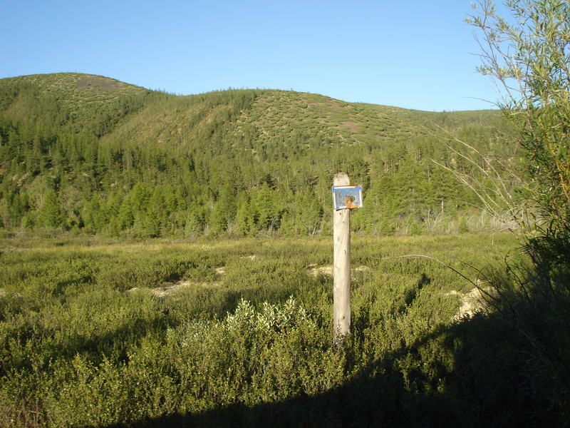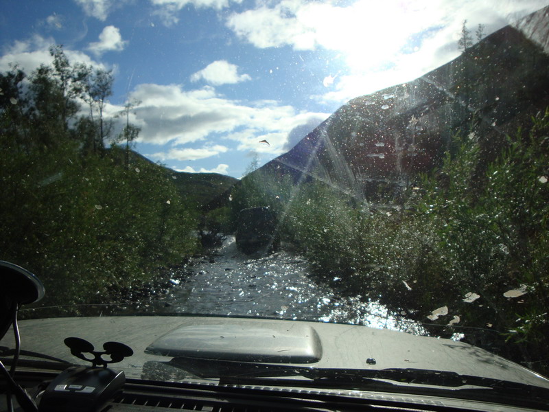 Останавливаемся пофоткаться, на часах 8 вечера…за рулем уже 14 часов, дорога начинает утомлять. До цели осталось около 12 км. Движемся дальше, дорога все хуже, Патрол еще пару раз садится на лежневке, но выбраться получается своим ходом, все таки жесткий задний лок это вещь. И вот через пару часов выходим в долину, где у дальних сопок и течет Кулу…и в самом конце пути, за 4 км до финиша чуть было не обламываемся по полной. Вылезшая из болота мерзлота напрочь разворотила ручей-дорогу по которой мы двигались. По бокам болотный кочкарник, впереди развороченное русло ручья из сыпуна, в который проваливаешься почти по самые болотники…деревьев естественно нет