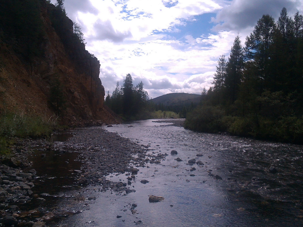 и на рыбалку! Пошли ниже по течению. Через метров триста попались первые хариусы, у товарища два, у меня один. Русло реки частично поменялось, некоторые плесы замыло, некоторые остались но слегка изменились. Хариус в них был, но в небольших количествах, два, три с плеса. Дошли до места где русло бьет в сопку и дальше перспективных мест не просматривалось, решили возвращатся. На обратном пути поймали еще по несколько штук. К двум часам были возле машины. Вспомнил что нужно сфотать