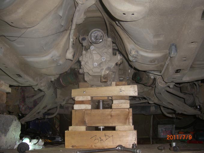 и, чтобы шток коробки вышел не цепляясь, задираю по максимуму заднюю ось, остальное отыграют подушки ДВС